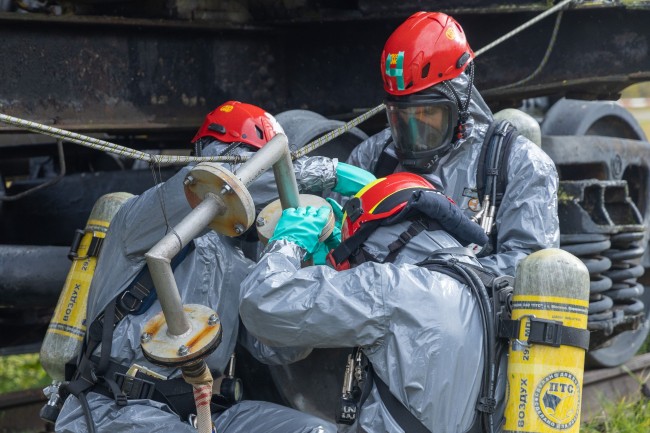 Специфика экипировки спасателей во время проведения подобных работ – это костюм химической защиты и дыхательный аппарат на сжатом воздухе с двумя баллонами. Чтобы выполнять задачи в такой экипировке, спасатель должен быть физически подготовлен, на чем коллектив аварийно-спасательной службы делает особый акцент.