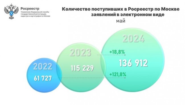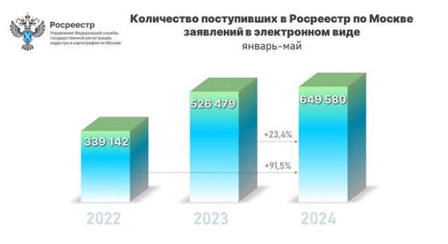 С января по май 2024 года Управлением Росреестра по Москве принято 649 580 электронных заявлений на регистрацию прав и постановку на кадастровый учет объектов недвижимости. Данный показатель увеличился почти на четверть (+23,4%) к 5 месяцам 2023 года (526 479), а к аналогичному периоду 2022 года (339 142) отмечен практически двукратный рост (+91,5%). Об этом сообщил руководитель Управления Росреестра по Москве Игорь Майданов.