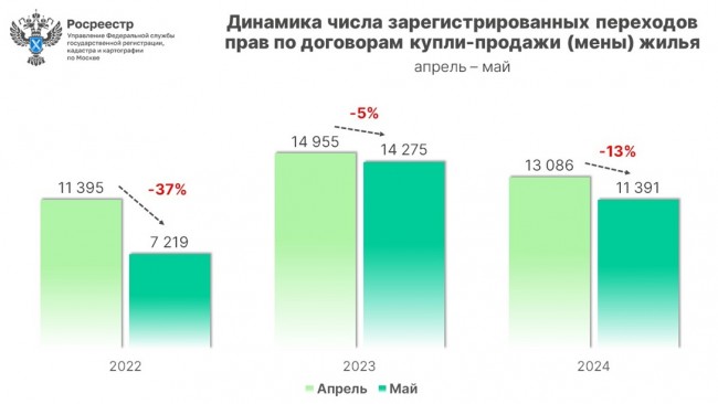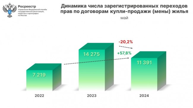 В мае 2024 года Управлением Росреестра по Москве зарегистрирован 11 391 переход прав на основании договоров купли-продажи (мены) жилья, что на 12,9% меньше показателя апреля текущего года (13 086).