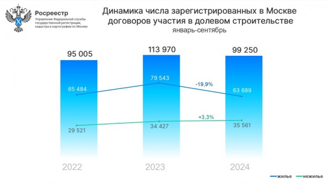 Всего в январе-сентябре 2024 года в Москве зарегистрировано 99 250 договоров долевого участия в строительстве в отношении жилой и нежилой недвижимости, что на 12,9% уступает показателю аналогичного периода прошлого года (113 970 ДДУ) и на 4,5% превосходит результат 2022 года (95 005 ДДУ).