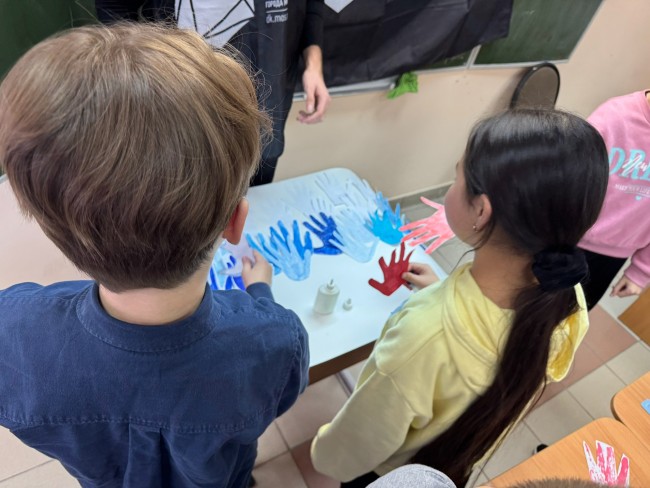 Школьники нарисовали ладошки, раскрасили и вырезали их из бумаги. После этого разноцветные ладошки наклеили на плаката.