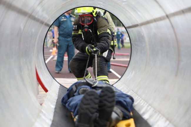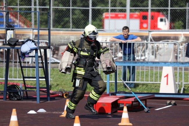 Последним и самым ответственным этапом стала специальная полоса, на которой оценивалась профессиональная подготовка огнеборцев. Конкурсантам предстояло правильно и быстро выполнить целый комплекс задач: сначала облачиться в боевую одежду и надеть дыхательный аппарат, затем кувалдой переместить балку на тренажере «Удар», пробежать змейкой между конусами с двумя пожарными рукавами, перекантовать большую покрышку и вскрыть дверь бензорезом, а после войти с пожарным рукавом наперевес и поразить мишень водой. Далее эвакуировать условного пострадавшего из тоннеля и взобраться по пожарной лестнице в башню – после этого дистанция считалась завершенной.