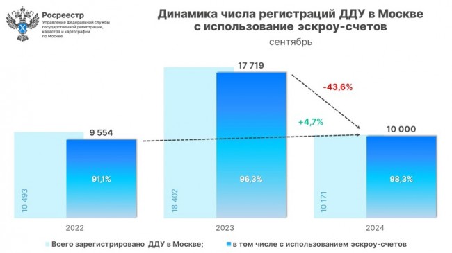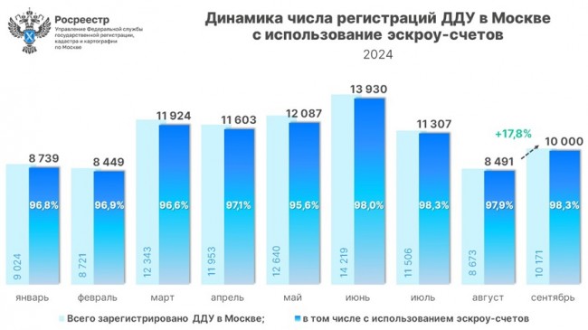 В сентябре 2024 года Управлением Росреестра по Москве зарегистрировано 10 000 договоров участия в долевом строительстве в отношении жилой и нежилой недвижимости с использованием эскроу-счетов. Число таких сделок увеличилось на 17,8% по сравнению с показателем августа (8 491 ДДУ).