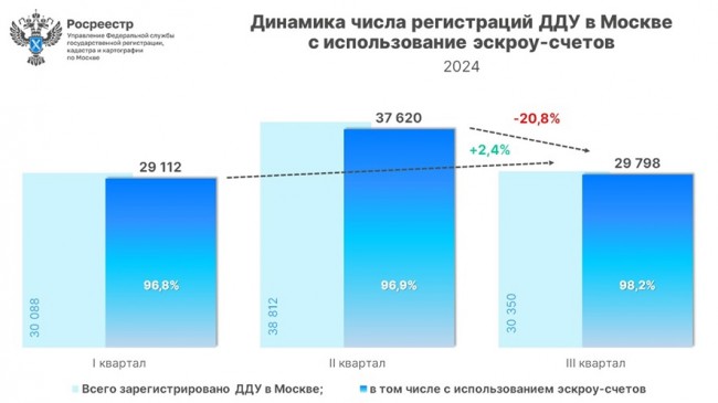 В III квартале 2024 года в Москве зарегистрировано 29 798 ДДУ с использованием эскроу-счетов. Это на 20,8% меньше результата II квартала (37 620 ДДУ), но на 2,4% превышает показатель I квартала (29 112 ДДУ). Доля сделок с эскроу за квартал составила 98%.
