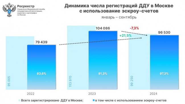 «С начала года в столице оформлено 96 530 ДДУ с использованием эскроу-счетов. Это второй после абсолютного рекорда в январе-сентябре 2023 года (104,1 тыс. ДДУ) максимальный показатель девяти месяцев. Отмечу, что с июня прошлого года доля ДДУ с эскроу стабильно держится на уровне свыше 90%», — комментирует Игорь Майданов, руководитель Управления Росреестра по Москве.
