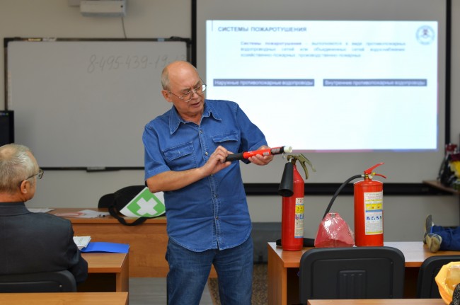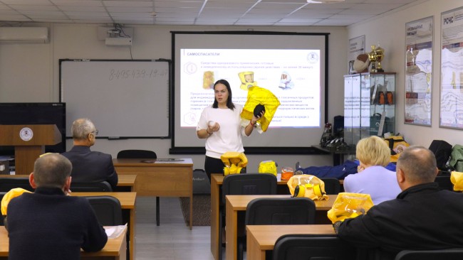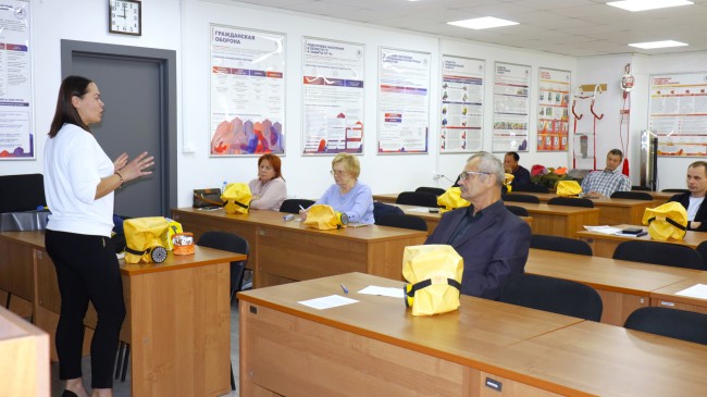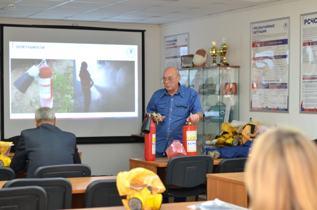 В практическую часть обучения также входили занятия по оказанию первой помощи, применению средств индивидуальной защиты органов дыхания и зрения, средств самоспасания людей с высоты и первичных средств пожаротушения.