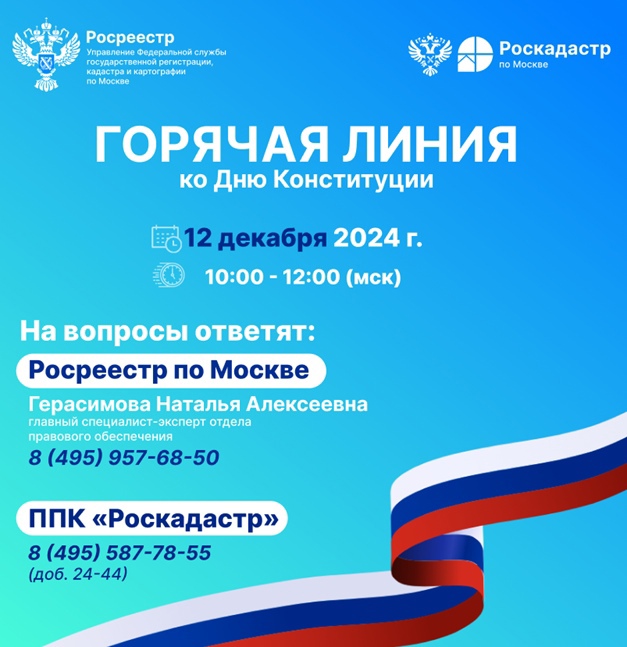 12 декабря 2024 года с 10:00 до 12:00 (мск) в День Конституции Российской Федерации Управление Росреестра по Москве и столичный Роскадастр проведут телефонную горячую линию по вопросам правовой помощи населению в оформлении недвижимости.
