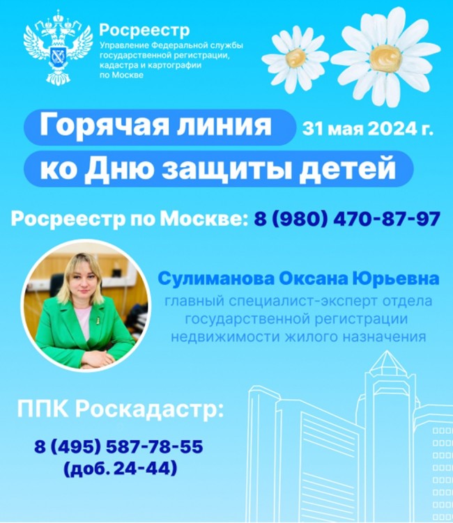 31 мая 2024 года с 10:00 до 14:00 (мск) Управление Росреестра по Москве и столичный Роскадастр проведут телефонную горячую линию по вопросам имущественных прав несовершеннолетних, приуроченную к Международному дню защиты детей.