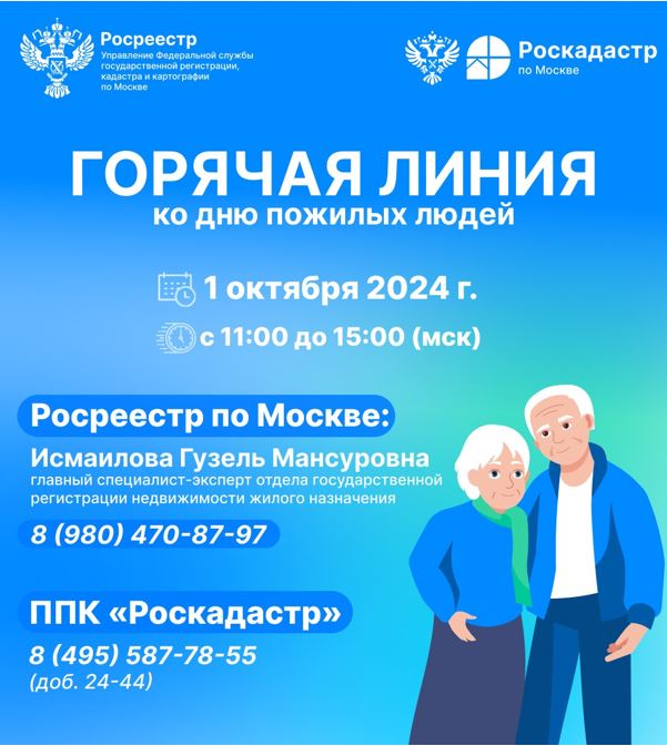 1 октября 2024 года с 11:00 до 15:00 (мск) в Международный день пожилых людей Управление Росреестра по Москве и столичный Роскадастр проведут телефонную горячую линию для людей старшего поколения по вопросам правовой помощи в оформлении недвижимости.