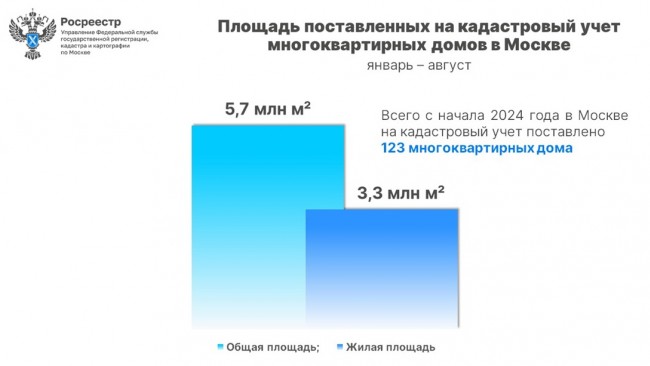 «За восемь месяцев этого года на кадастровой карте столицы появилось 123 многоквартирных дома, включая свыше 30 новостроек, оформленных по программе реновации. Общая площадь новых жилых комплексов составила 5,7 млн квадратных метров, из них 3,3 млн «квадратов» жилой площади», — отметил Игорь Майданов, руководитель Управления Росреестра по Москве.