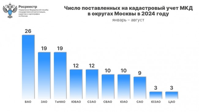 Наибольшее число учтенных с начала текущего года домов пришлось на ВАО (26 МКД). На втором месте ЗАО и ТиНАО (по 19 МКД). Также в тройку округов-лидеров по данному показателю вошли ЮВАО и СЗАО (по 12 МКД). На эти административные округа столицы пришлись 71,5% всех многоквартирных домов, поставленных на кадастровый учет в январе-августе 2024 года.