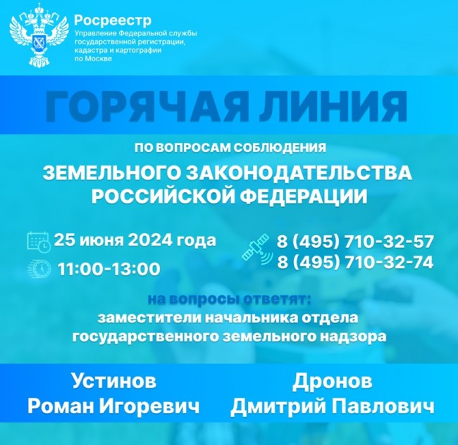 Управление Росреестра по Москве информирует о проведении 25 июня 2024 года с 11:00 до 13:00 по московскому времени «горячей линии» по вопросам соблюдения земельного законодательства Российской Федерации.