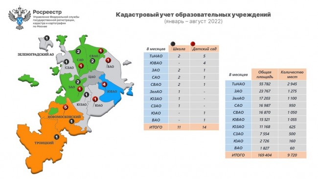 «Учет новых образовательных объектов ведется повсеместно на территории Москвы. На кадастровой карте всех столичных округов, за исключением Центрального, с начала года появились новые объекты, где-то школы, где-то детские сады, в Новой Москве, в Западном, Северном и Северо-Восточном округах сразу и те, и другие. Общая площадь 25 объектов достигла без малого 170 тысяч квадратных метров, это 9 720 мест для детей всех возрастов», — комментирует Игорь Майданов, руководитель Управления Росреестра по Москве.