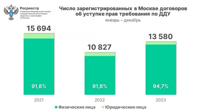 Управлением Росреестра по Москве зарегистрировано 13 580 договоров об уступке прав требования по договорам участия в долевом строительстве за прошлый год. Данный показатель на 25,4% превышает результат 2022 года (10 827).