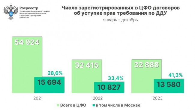 В январе-декабре 2023 года доля Москвы в общем объеме всех зарегистрированных в Центральном федеральном округе договоров об уступке прав требования по ДДУ (в ЦФО –32 888) составила 41,3%.