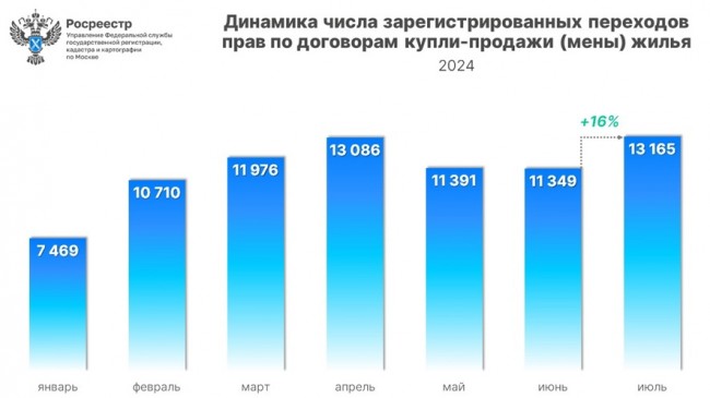 В июле 2024 года Управлением Росреестра по Москве зарегистрировано 13 165 переходов прав на основании договоров купли-продажи (мены) жилья. За месяц число оформленных в столице вторичных сделок увеличилось на 16% (11 349).