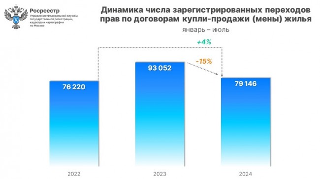 Всего в январе-июле 2024 года зарегистрировано 79 146 переходов прав по договорам купли-продажи (мены) жилья. Данный показатель уступил 15% результату семи месяцев прошлого года (93 052), но продемонстрировал рост на 4% к аналогичному периоду 2022 года (76 220).