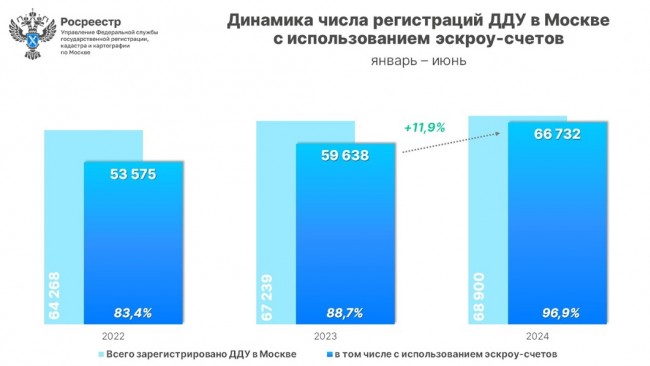 Всего в январе-июне 2024 года в Москве зарегистрировано 66 732 ДДУ с использованием эскроу-счетов. Данный показатель вырос на 11,9% по отношению к первым шести месяцам 2023 года (59 638 ДДУ) и на 24,6% больше аналогичного периода 2022 года (53 575 ДДУ). «Это максимальный с 2019 года показатель для первого полугодия, а также рекордная доля от общего числа оформленных ДДУ за первые шесть месяцев», — добавил Игорь Майданов.