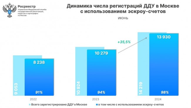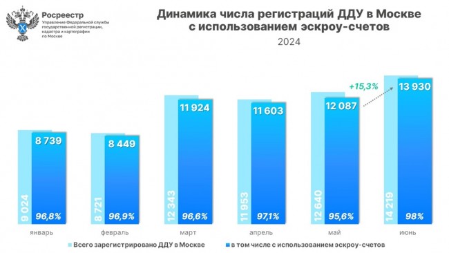 В июне 2024 года Управлением Росреестра по Москве зарегистрировано 13 930 договоров долевого участия в строительстве на рынке жилой и нежилой недвижимости с использованием эскроу-счетов, что на 15,3% больше результата в мае текущего года (12 087 ДДУ).
