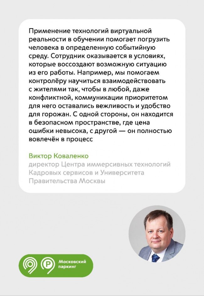 «Все контролеры «Московского паркинга» обучились на VR-тренажерах Университета Правительства Москвы. Это отличная подготовка к работе, она позволяет лучше адаптироваться к повседневным обязанностям, а также разобрать различные ситуации, чтобы легко справиться с ними уже в реальной жизни. Использовать самые современные технологии для обучения работников Транспортного комплекса — такую задачу поставил Мэр Москвы Сергей Собянин», — отметил Максим Ликсутов.