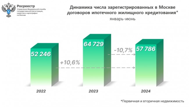 За первые 6 месяцев 2024 года Управлением Росреестра по Москве зарегистрировано 57 786 договоров ипотечного жилищного кредитования на первичном и вторичном рынках недвижимости. Показатель уменьшился на 10,7% к аналогичному периоду прошлого года (64 729) и вырос на 10,6% к январю-июню 2022 года (52 246). Об этом сообщил Игорь Майданов, руководитель Управления Росреестра по Москве.