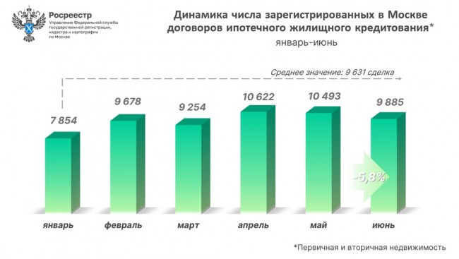 «Статистика отражает данные с учетом ипотечных сделок как на первичном, так и на вторичном рынках столичной недвижимости. В данном случае на снижение показателя в первом полугодии повлиял вторичный сегмент, где число регистраций переходов прав уменьшилось. Полугодовая статистика также демонстрирует, что в среднем за месяц оформляется 9,6 тысячи ипотек. Показатель июня этому значению соответствует и превышает его примерно на 2,6%», — рассказал Игорь Майданов.