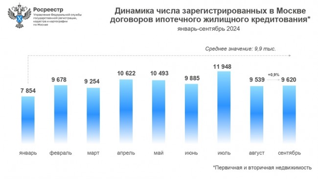 В сентябре 2024 года в Москве зарегистрировано 9 620 договоров ипотечного жилищного кредитования на первичном и вторичном рынках недвижимости, что на 0,9% превышает результат августа текущего года (9 539). Об этом сообщил руководитель Управления Росреестра по Москве Игорь Майданов.