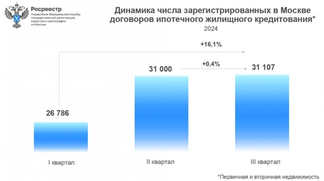 «В квартальном разрезе число сделок с первичной и вторичной недвижимостью демонстрирует небольшой прирост. Третий квартал 2024 года (31 107) превышает второй (31 000) на 0,4% и первый (26 786) на 16%. После июльского пика рынок продолжает адаптироваться к одновременному завершению программы льготного жилищного кредитования и повышению ключевой ставки. Осенний сезон, при этом, стартовал с умеренной динамики покупательской активности на ипотечном рынке столицы», — прокомментировал Игорь Майданов.