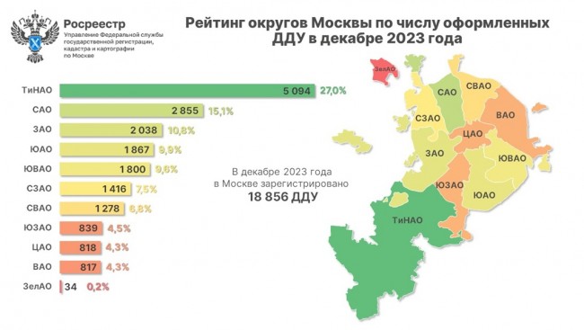В декабре 2023 года Управлением зарегистрировано 18 856 ДДУ. При этом в Троицком и Новомосковском административных округах (ТиНАО) зарегистрировано 27% (5 094 ДДУ) от всех первичных сделок. На втором и третьем месте по числу оформленных ДДУ, как и в ноябре прошлого года, остались САО, где за месяц зарегистрировали 15,1% (2 855 ДДУ), и ЗАО – 10,8% (2 038 ДДУ).