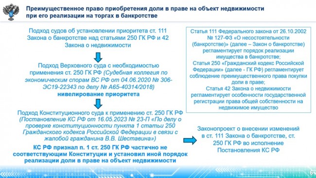 В заключении рассмотрели вопрос преимущественного права приобретения доли в праве на недвижимость, которая реализуется на торгах при банкротстве. В частности, обсудили законопроект о внесении изменений в ст. 111 Федерального Закона «О несостоятельности (банкротстве)» от 26.10.2002 № 127-ФЗ во исполнение постановления Конституционного суда РФ от 16.05.2023 № 23-П. Законопроект должен обеспечить супругов с общедолевой собственностью приоритетным правом выкупа доли в праве на квартиру, реализуемую на торгах.