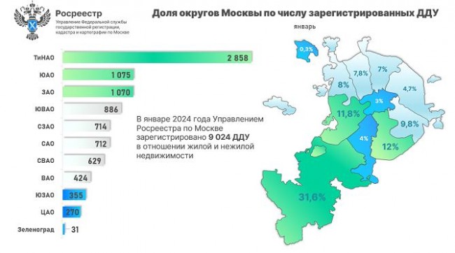 Управлением Росреестра по Москве подведены итоги января 2024 года среди административных округов столицы по количеству зарегистрированных договоров долевого участия на рынке жилой и нежилой недвижимости. С начала года лидерство по числу регистраций осталось за ТиНАО, который возглавил рейтинг с результатом в 2 858 ДДУ или 31,6% от всех оформленных первичных договоров в Москве за месяц (9 024 ДДУ).