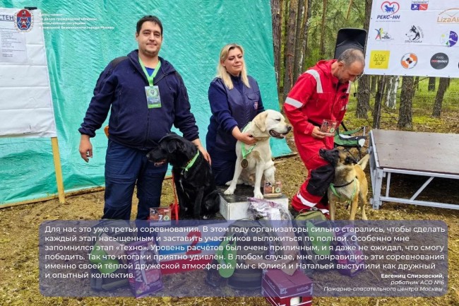 По итогам состязаний, Пожарно-спасательный центр Москвы занял первое место в командном этапе. В личном зачёте Евгений Слизовский и его собака Питер заняли второе место, Наталья Стародубцева и её четвероногий коллега Гардей – первое.