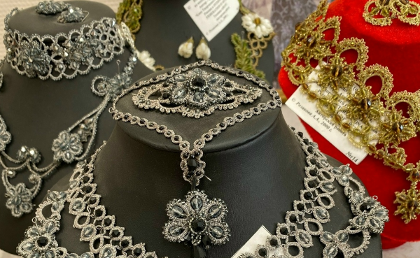 В нее войдут уникальные авторские украшения в техниках фриволите и бисероплетения. В частности, посетители увидят колье, броши-цветы, браслеты, серьги, воротники и композиции с камнями.