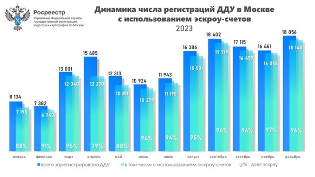 В декабре 2023 года Управлением Росреестра по Москве зарегистрировано 18 140 договоров с применением эскроу-счетов, что составило 96% от общего числа договоров на первичном рынке (18 856 ДДУ).