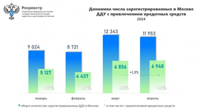 В апреле 2024 года Управлением Росреестра по Москве зарегистрировано 6 948 договоров долевого участия в строительстве жилой и нежилой недвижимости с привлечением кредитных средств, что на 1,3% больше, чем в предыдущем месяце (6 856 ДДУ). При этом доля сделок с ипотекой достигла 58% от всех договоров на первичном рынке и стала максимальным значением с начала года.