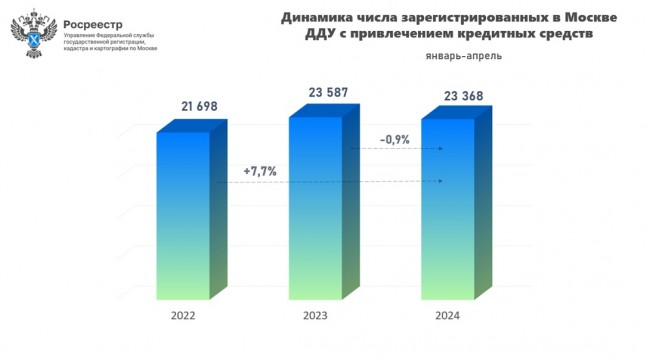 За 4 месяца текущего года Росреестром по Москве зарегистрировано 23 368 ДДУ с привлечением ипотеки. К аналогичному периоду прошлого года (23 587 ДДУ) спад составил менее процента (0,9%), а в сравнении с показателем 2022 года (21 698 ДДУ) число регистраций кредитных договоров на первичном рынке увеличилось на 7,7%.