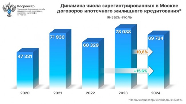 «Июльское число зарегистрированных ипотек превышает все предыдущие показатели 2024 года, установив новый максимум в практически 12 тысяч договоров. Среди аналогичных месяцев прошлых лет – это второй результат после рекордного 2023 года, когда было зарегистрировано 13,3 тыс. ипотек. Очевидно, что такая картина является отражением действий главного финансового регулятора и реализацией потребительских намерений по приобретению недвижимости по заранее одобренным кредитам – до вступления новых правил и изменения ставок ипотечного кредитования», — комментирует Игорь Майданов, руководитель Управления Росреестра по Москве.