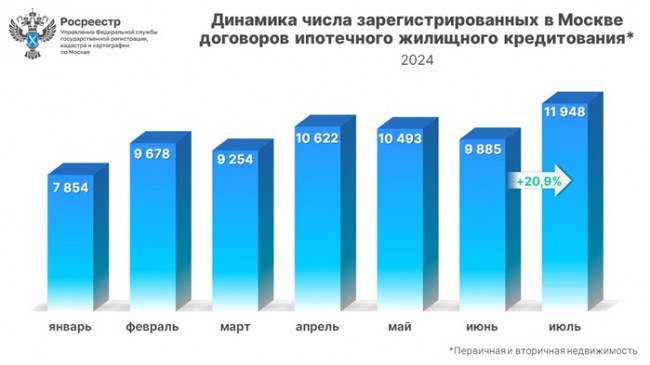 В июле 2024 года Управлением Росреестра по Москве зарегистрировано 11 948 договоров ипотечного жилищного кредитования на первичном и вторичном рынках недвижимости, что на 20,9% превышает показатель июня текущего года (9 885).