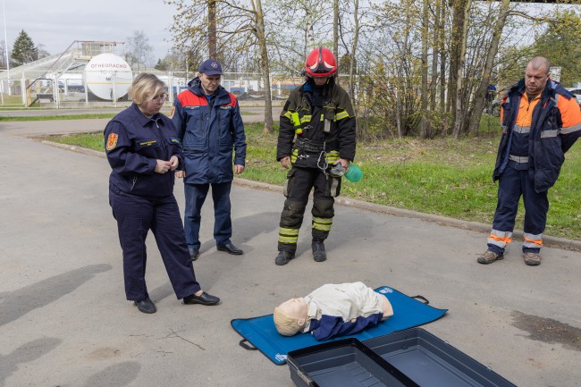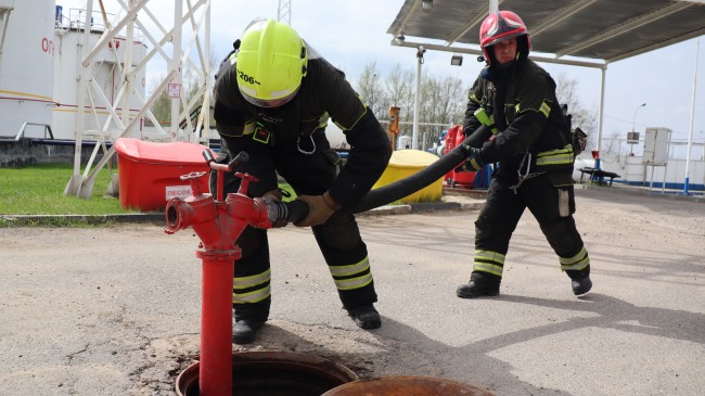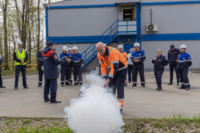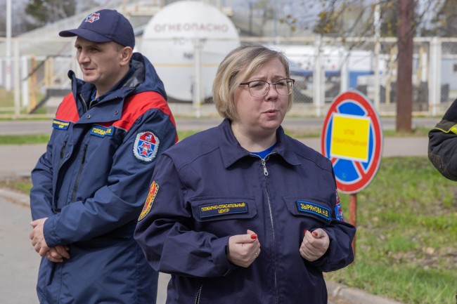 По легенде на пульт диспетчера пожарно-спасательной службы от сотрудника одного из топливно-заправочных комплексов поступило сообщение о возгорании резервуара с топливом. К моменту прибытия пожарного расчета персонал был эвакуирован в безопасное место, склад обесточен, технологический процесс остановлен. Прибыв на место в кратчайшие сроки, пожарные оперативно приступили к тушению условного возгорания и охлаждению рядом стоящих резервуаров. Благодаря слаженным действиям участников пожарно-тактического занятия «пожар» был оперативно ликвидирован.