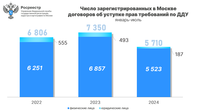 «Несмотря на тенденцию к сокращению числа уступок прав по ДДУ, Москва сохраняет лидирующую позицию по объему регистрации переходов прав требования в Центральном федеральном округе. Так, по итогам первого полугодия, доля столицы составила 42% от всех подобных сделок в ЦФО (11 867). Для сравнения в 2023 году за аналогичный период в городе зарегистрировали 43% уступок, а в 2022 году — 35%», — сообщил Игорь Майданов, руководитель Управления Росреестра по Москве.