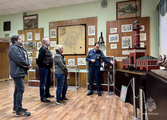 Экскурсия для гостей началась с истории становления пожарной службы, которая берет начало еще со времен Ивана Грозного. По тематическим стендам гости проследили за хроникой крупных и знаковых пожаров Москвы, узнали, как происходило тушение в те времена. Также познакомились с раритетными касками начальников пожарной службы Москвы и увидели уникальный пожарный насос, с помощью которого тушили пожар в Большом Театре.
