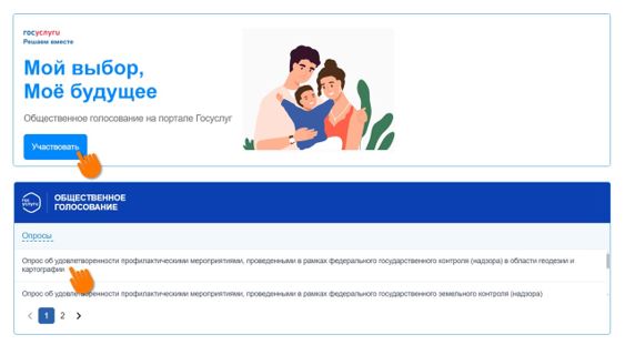 2) на сайте Росреестра*, перейдя по ссылке на портал Госуслуг «Мой выбор, мое будущее», где выбрать «Опрос об удовлетворенности профилактическими мероприятиями, проведенными в рамках федерального государственного контроля (надзора) в области геодезии и картографии».