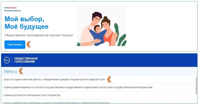 - на сайте Росреестра*, перейдя по ссылке на портал Гослуслуг «Мой выбор, мое будущее», где выбрать «Опрос по оценке качества работы с обращениями граждан в Росреестре во II квартале 2024».