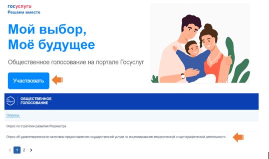 2) на сайте Росреестра*, перейдя по ссылке на портал Гослуслуг «Мой выбор, мое будущее», где выбрать «Опрос об удовлетворенности качеством предоставления государственной услуги по лицензированию геодезической и картографической деятельности».