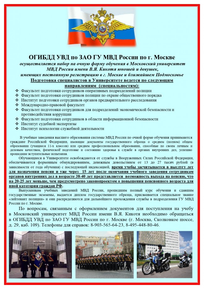 ОГИБДД УВД по ЗАО ГУ МВД России по г. Москве осуществляется набор на очную форму обучения в Московский университет МВД России имени В.Я. Кикотя юношей и девушек, имеющих постоянную регистрацию в г. Москве и ближайшем Подмосковье