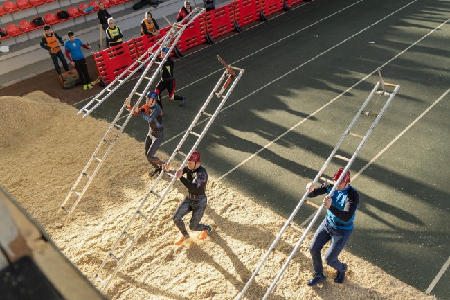 При подъеме по штурмовой лестнице спортсмен должен пронести пожарную лестницу до учебной башни, расположенной на расстоянии 32-х метров от старта, приставить ее к окну и забраться на четвертый этаж.
