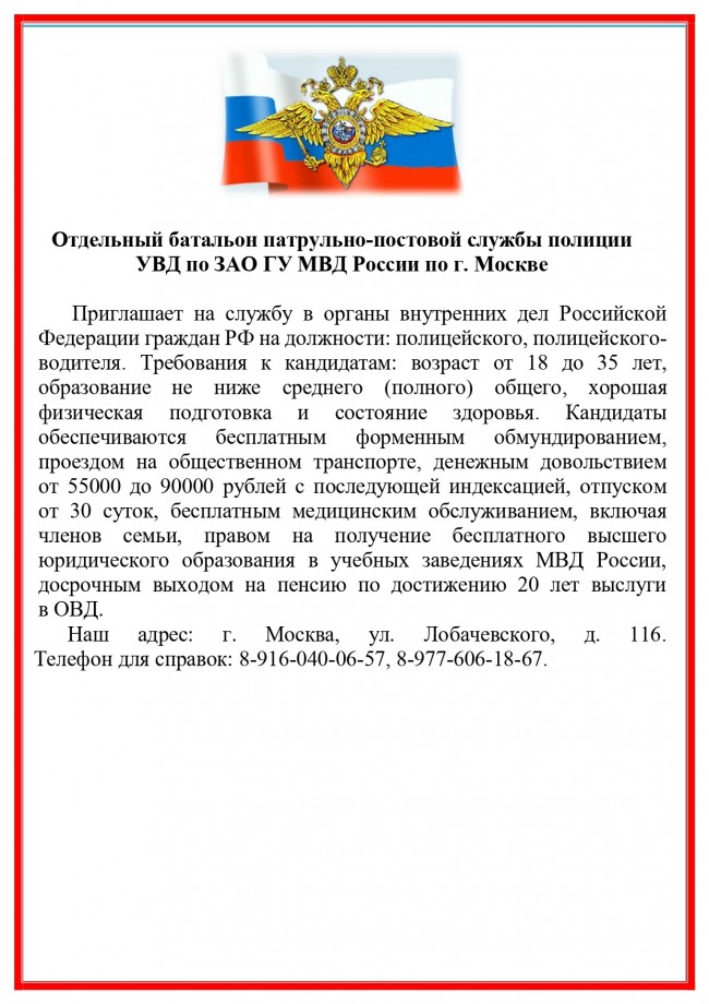 Отдельный батальон ППС полиции УВД по ЗАО приглашает на службу в органы внутренних дел РФ