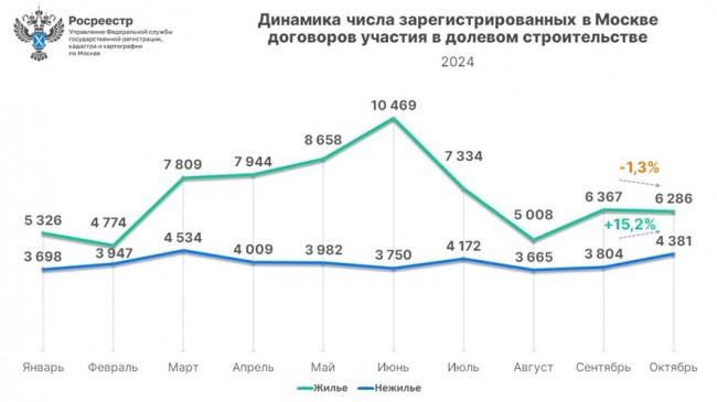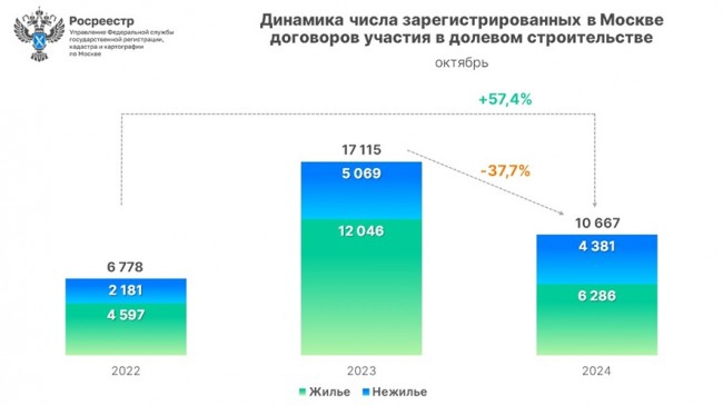 В октябре 2024 года Управлением Росреестра по Москве зарегистрировано 10 667 договоров участия в долевом строительстве в отношении жилой и нежилой недвижимости, что на 4,9% больше результата сентября (10 171 ДДУ).