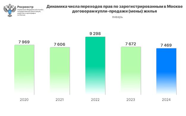 В январе 2024 года Управлением Росреестра по Москве зарегистрировано 7 469 переходов прав на основании договоров купли-продажи (мены) жилья, что, с разницей в 203 сделки, практически сопоставимо c первым месяцем прошлого года (7 672) и на 19,7% ниже января 2022 года (9 298).