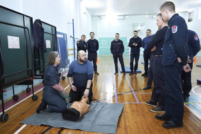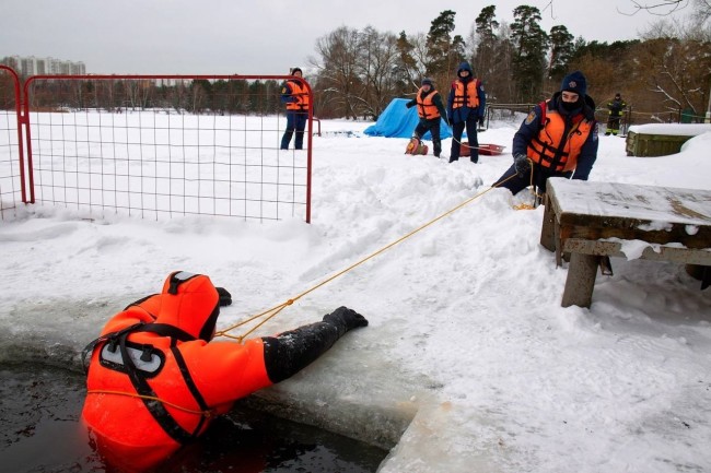 Зимой важным сценарием является спасение провалившегося под лёд человека: выход по спасательной тревоге, алгоритм помощи пострадавшему, взаимодействие с городскими службами, действия старшего дежурной смены, выбор правильного оборудования и снаряжения, разговор с очевидцем происшествия – всё это демонстрируют спасатели, разбирая собственные действия и получая обратную связь от преподавателя.